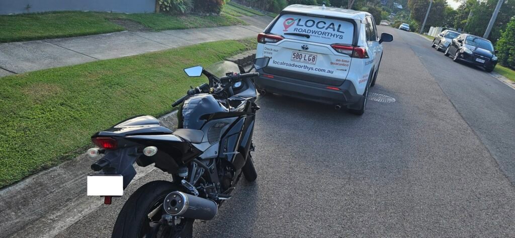 These are the items you can easily check yourself before booking. A full roadworthy inspection also covers suspension components, steering head bearings, wheel bearings, driveline, electrical components, exhaust, headlight aiming, frame condition, chassis, and modifications. You can’t check all of these yourself without tools and experience – that’s what the inspection is for.