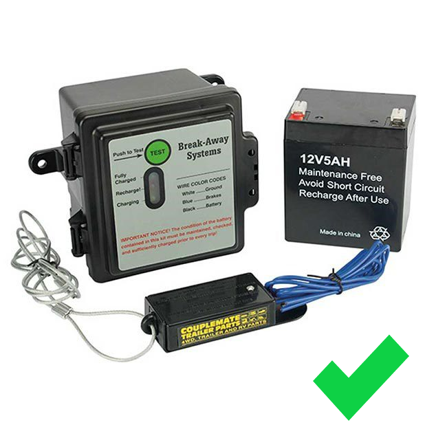 Breakaway brake system – mandatory on trailers with a GTM of 2 tonnes or more. This battery-operated emergency system applies the brakes if the trailer disconnects from the towing vehicle. The battery must be charged.